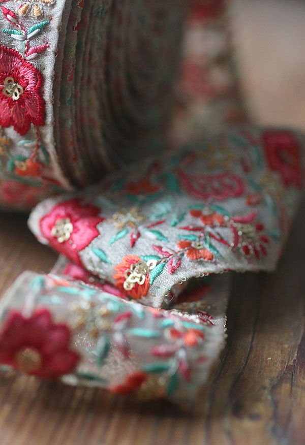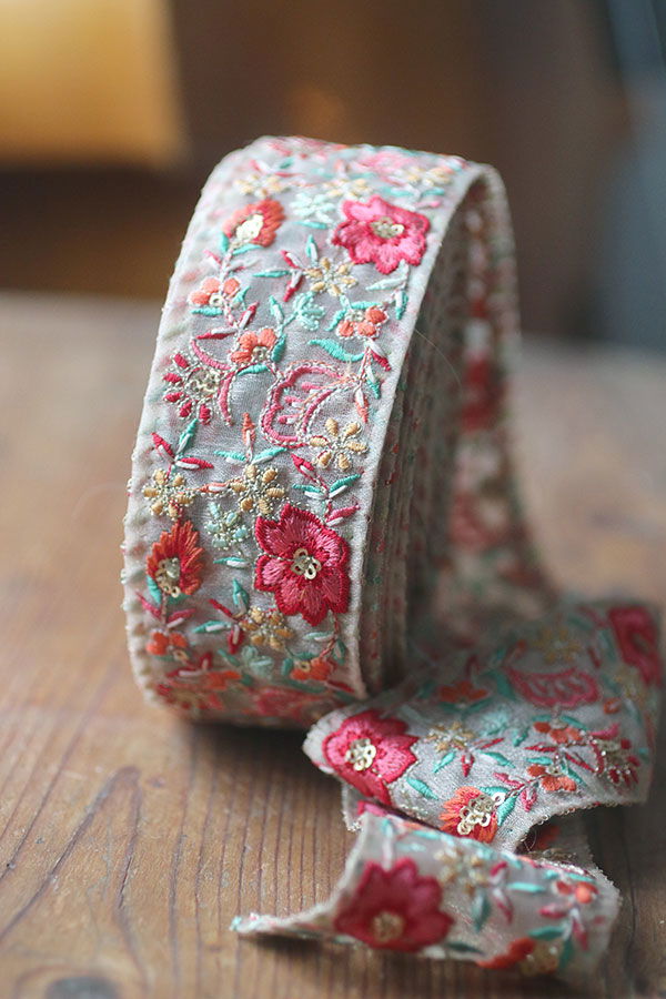 • Broderier i olika röd-rosa färger samt milda gröna färger