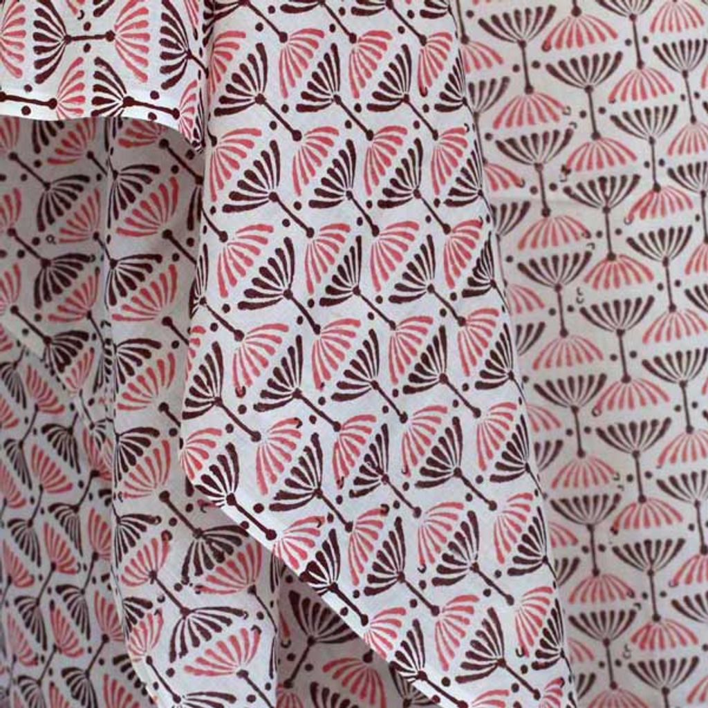 Ett mycket mjukt och smidigt tyg med bra fall. Mörkröda/ljusröda blommor. Ett fantastiskt hantverk som bara en kunnig i blocktryck kan behärska.