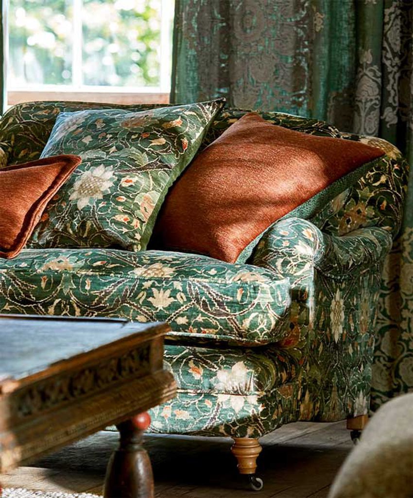 Mönstret till denna vackra sammet designades av John Henry Dearle som arbetade under stor del sitt liv under William Morris överinseende. Det vackra mönstret med persiska influenser ritades av Dearle i slutet av 1890 talet och är nu överfört till en magiskt vackert sammet.