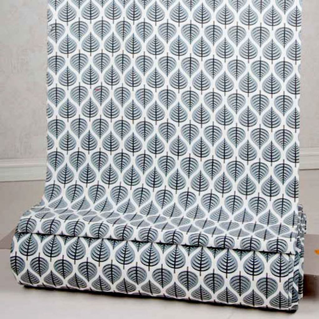 Tyg i 100% ljust oblekt bomull, kvalitén heter Duck fabric och är en tunn och smidig canvas. Ytan på tyget är lite grövre men det stör inte blad-trycket utan ger bara ett extra fint utseende. Mönstret på tyget föreställer björkblad och är tryckt för hand i Indien med så kallat screentryck, ett rent hantverk där stora ramar av trä används.